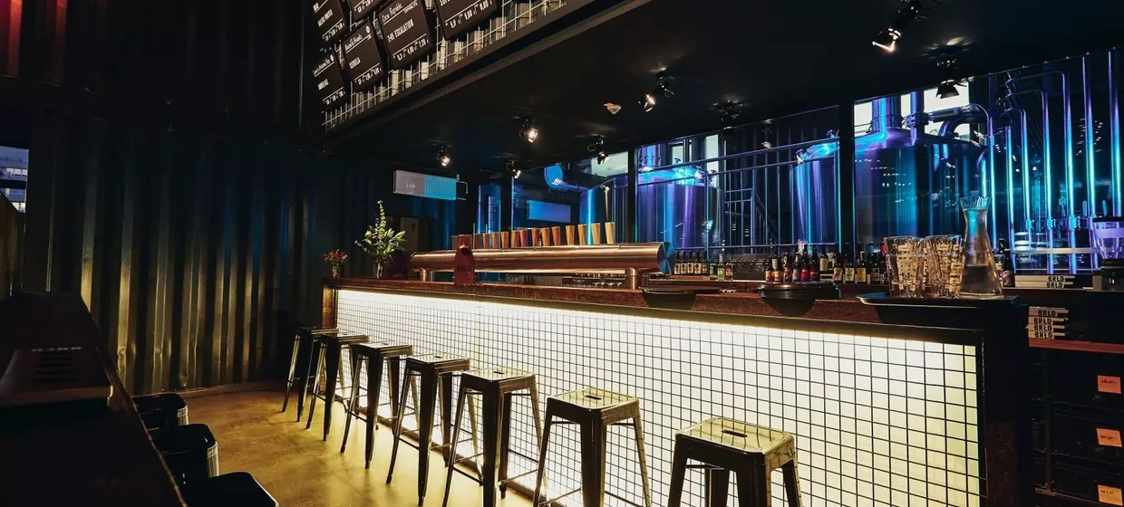 Container-Architektur, eigene Brauerei, Biergarten